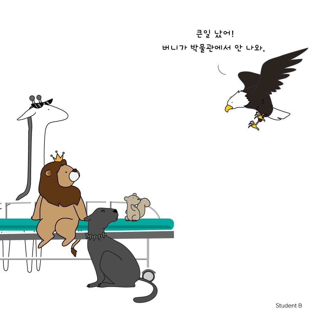 "큰일 났어! 버니가 박물관 직원에게 잡혀간 것 같아!”