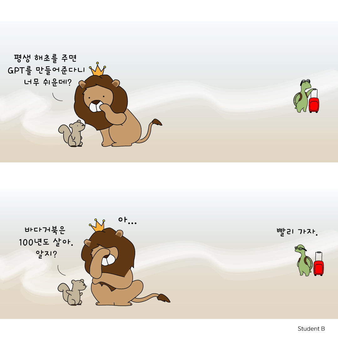 거북이는 사자의 제안을 바로 거절했다. 사자를 따라가면 왠지 자신에게 엄청나게 많은 일이 쏟아질 것 같다는 예감이 들었기 때문이었다.