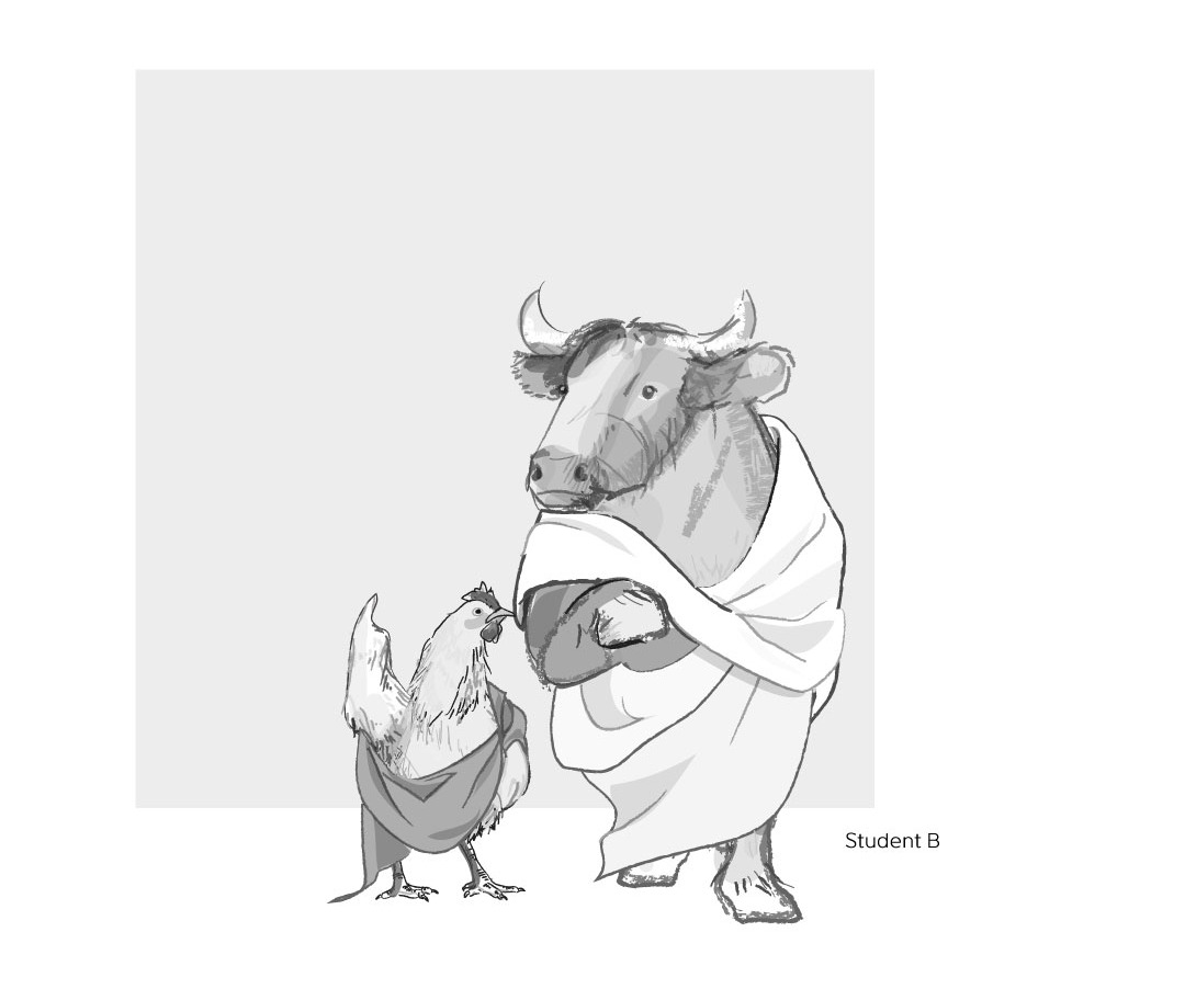 3) 무(Moo)와 꼬꼬닭(Cocodak)은 지금은 소실되었지만, 로마 시대 당시 가장 큰 도서관이라고 알려진 "알렉산드리아 도서관"에 직접 찾아 내려갔다. 그곳에 들어가 정신없이 책을 읽던 무와 꼬꼬닭은 그들을 발견한 인간들에게 잡혀가 가축이 되어버리고 만다.