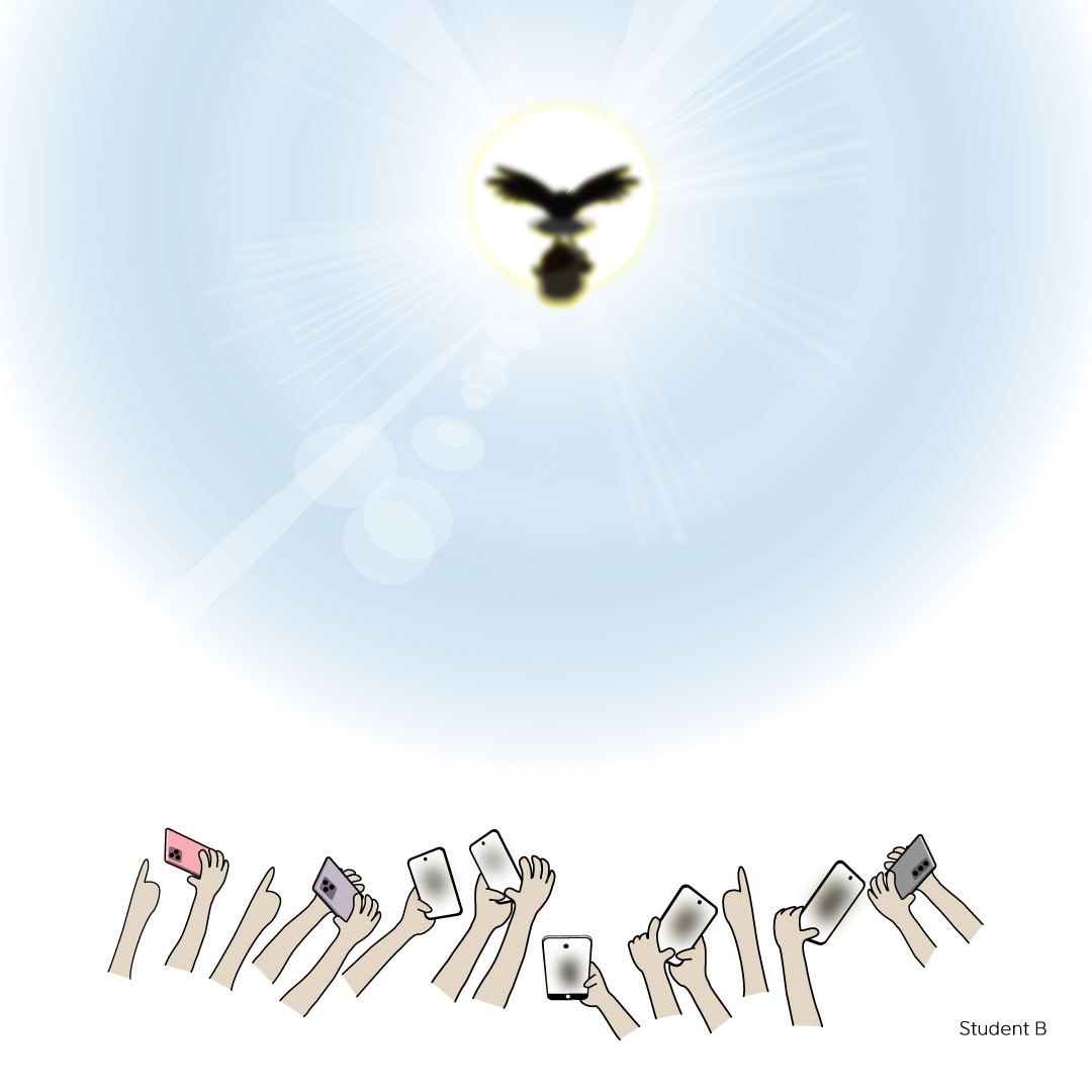 독수리가 사자를 잡아채 날아가는 믿을 수 없는 광경에 경악하던 사람들은 정신을 차리고 그 장면을 사진에 담기 위해 너도나도 핸드폰을 꺼내 하늘을 향해 들었다. 하지만, 오후 두 시의 강렬한 햇빛에 초점을 맞추지 못했다. 그렇게 사자를 태운 독수리는 빠른 속도로 멀어져 갔다.