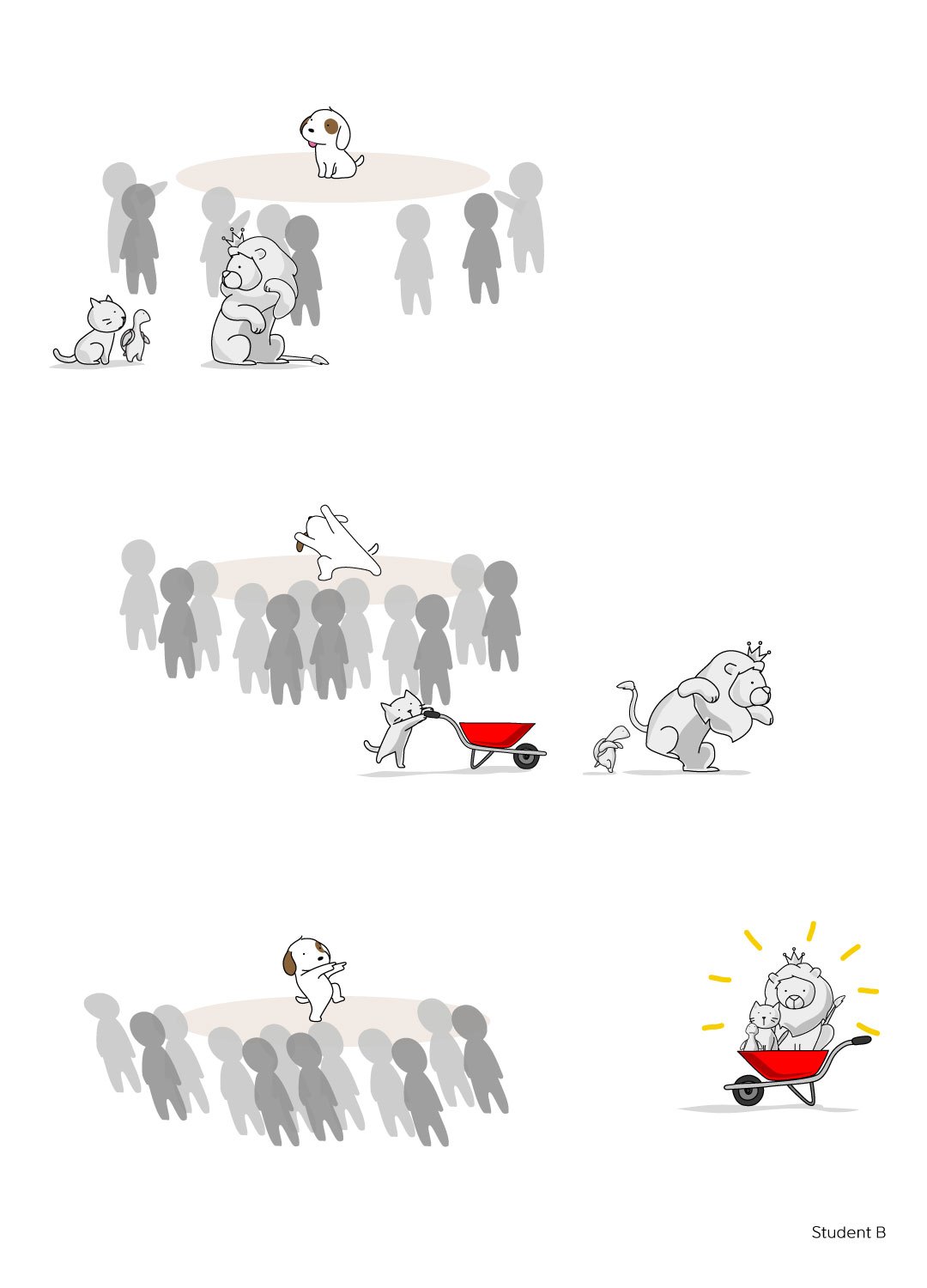 정확히 오후 1시, 해가 중천에 떠오를 때였다. 강아지가 홀연히 대영박물관 정문 쪽으로 접근하더니, 경비원 앞에서 갑자기 두 발로 일어나서 춤을 추기 시작했다. 춤을 추는 강아지가 어찌나 신기한지, 경비원은 강아지를 넋을 놓고 바라보았고, 주변의 관광객들이 하나둘씩 모여들어 강아지를 에워싸기 시작했다. 그리고 이 틈을 타서, 정문까지 접근한 사자와 고양이는 자신들이 가져온 손수레 위에 올라가 마치 석상인 척 정지 자세로 있었다.