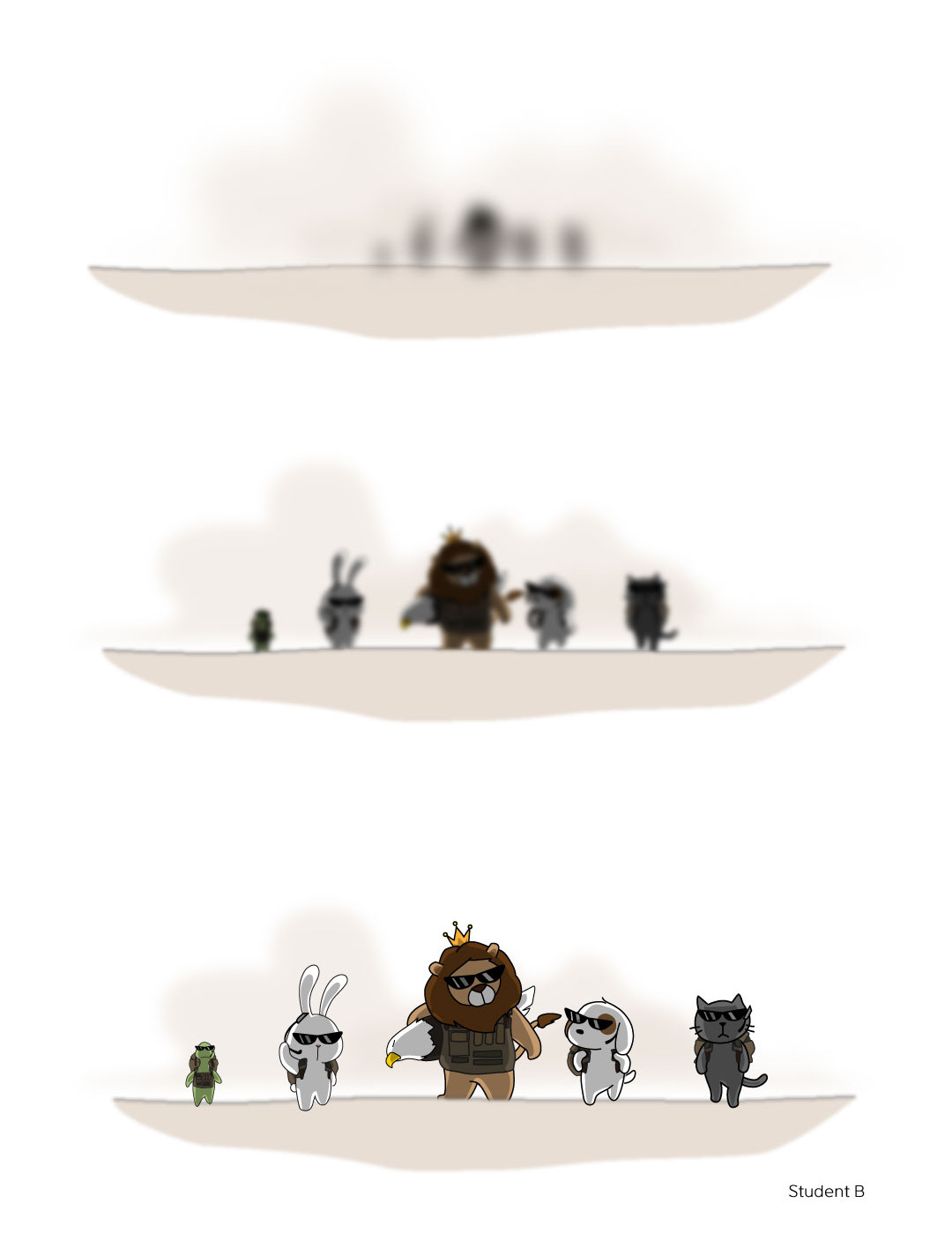 너구리가 다급하게 무전을 반복했지만 아무런 대답이 없었다. 그리고 이 교신을 듣던 동물들은 놀란 마음에 사자 일행이 추락한 곳으로 생각되는 사바나의 평원으로 달려 나갔다.
