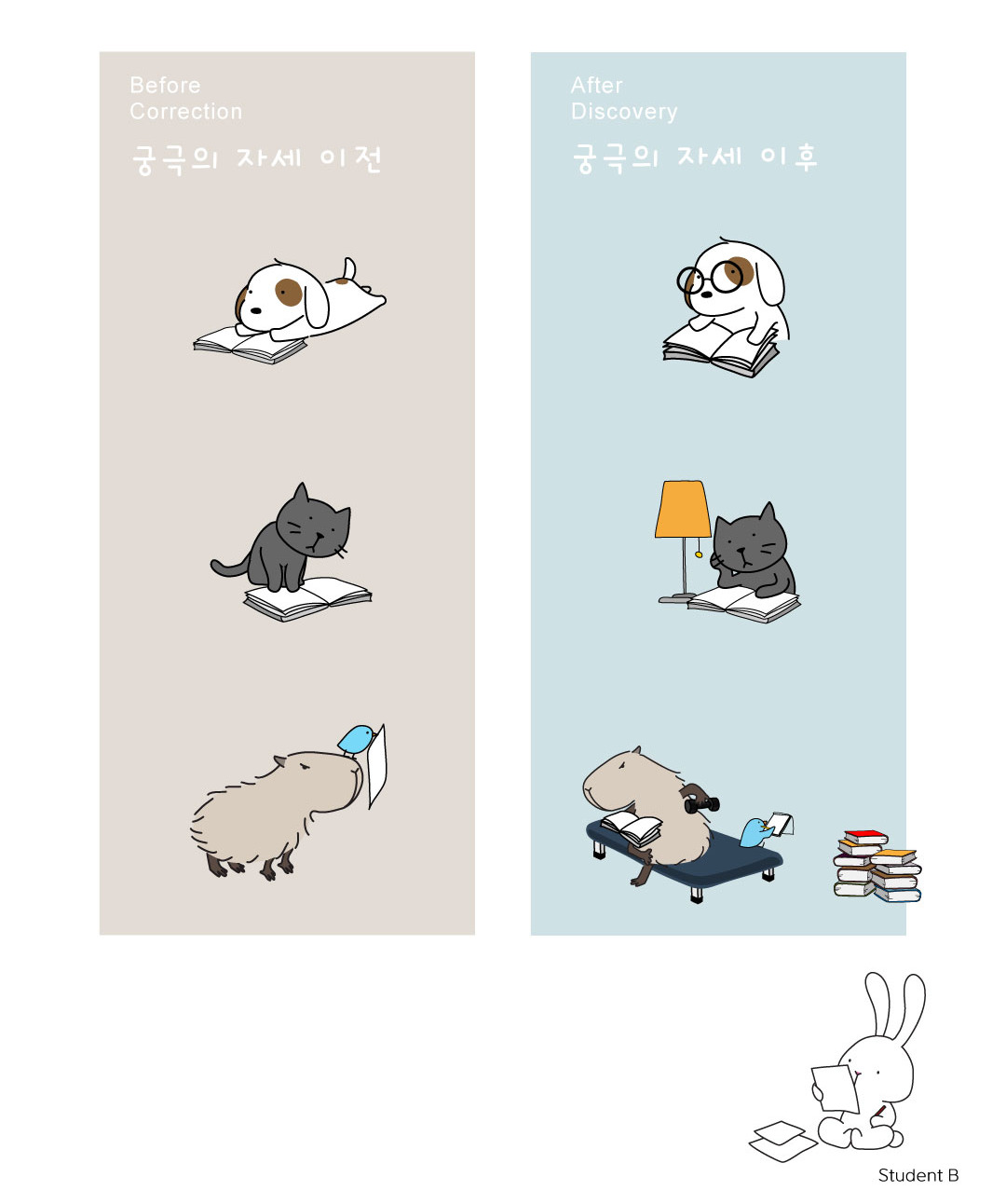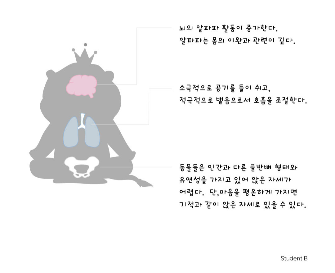 사자가 요가책에서 이 자세를 본 적도 없는데, 어떻게 이 자세를 알게 된 것일까? 어렸을 적, 앉아서 책을 읽어주던 어머니의 모습에서 단서를 얻었을 수도 있고, 혹은 선대 사자가 앉아 있는 모습에서 힌트를 얻었을 수도 있다. 다만 가장 중요한 것은, 이 자세의 발견 덕분에 동물들이 앞으로 제대로 공부할 수 있게 되었다는 점이다. 이제 동물들은 엎드린 자세가 아닌, 앉은 자세로 장시간 공부할 수 있게 되었으며, 마음의 방해를 받지 않고 인간 지식에 대해 생각할 수 있는 길을 열게 되었다. 1) 2)