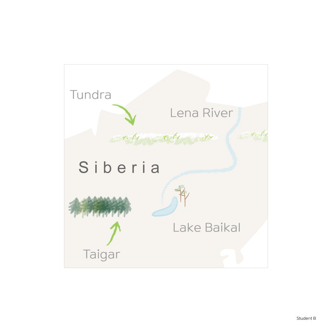 2) 레나강은 바이칼호에서 발원하여 북쪽으로 흐르며 북극해에 이르는 긴 강이다. 남쪽에서 북쪽으로 갈수록, 주변 식생은 침엽수림이 우거진 타이가 지역에서 점차 이끼만이 자라는 툰드라 지역으로 변화한다.