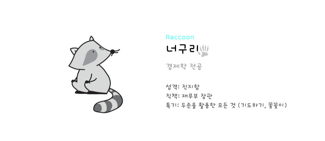 너구리는 '최고의 일곱 마리' 중 유일하게 인간의 제도권 교육을 가까이에서 경험한 동물로, 사회과학을 공부한 동물을 대표한다. 어릴 때부터 MIT와 하버드 대학의 쓰레기통을 뒤지며 학생들이 남긴 피자를 먹고 자라던 너구리는 어느 날 한 교수가 학생들에게 풀어보라고 칠판에 적어둔 어려운 문제를 가볍게 풀어내고서는 자신의 실력이 결코 인간들에 비해 뒤처지지 않음을 알게 된다.