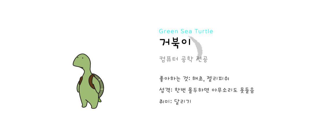 거북이는 동물 세계에서 몇 안 되는 컴퓨터 전공자로, 동물-인간 언어 GPT를 개발하여 스튜던트 비의 동물들이 공부를 시작하는데 지대한 역할을 한다. 변온 동물인 거북이는 평소에는 무심하고 냉정하지만, 한 번 무언가에 몰두해 피가 끓기 시작하면 그 누구보다도 열심히 그 일을 해낸다.