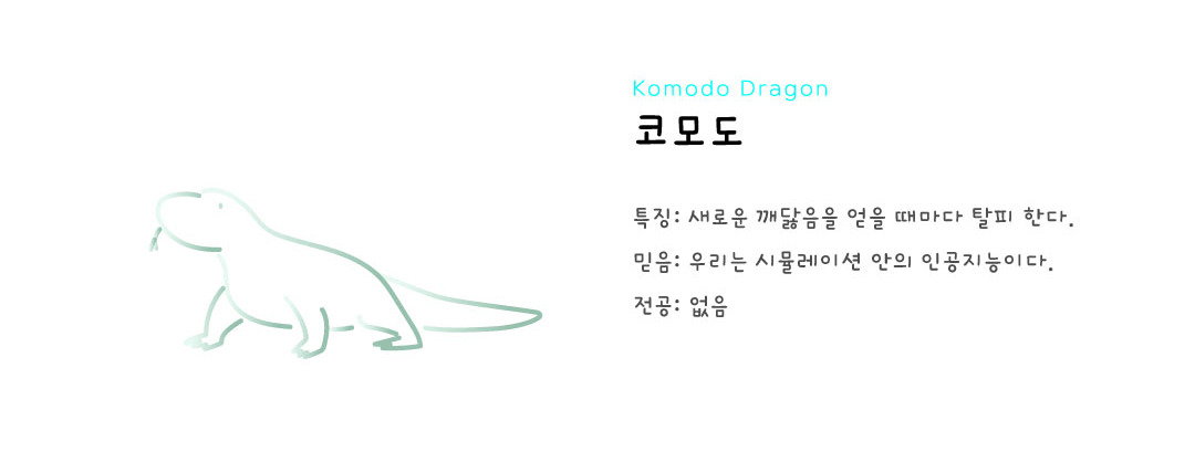 1) 스튜던트 비의 세계에서 파충류들은 새로운 깨달음을 얻을 때마다 탈피를 한다. 파이썬 역시 본래 녹색이었으나, 수차례의 탈피를 거쳐 노란색으로 변화하였다. 파이썬보다 훨씬 더 많은 탈피를 경험한 코모도는 거의 투명색에 가깝다.