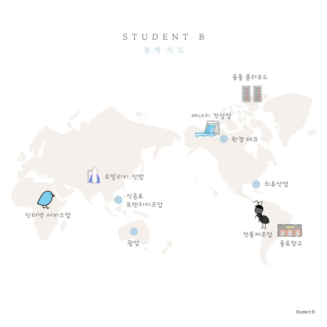 한편, '파랑새 기업'이나 '개미 기업'과 같은 대기업은 아니지만 각 대륙에는 그 지역 동물들의 공부 방향과 밀접하게 연결된 산업들이 자리하고 있다.