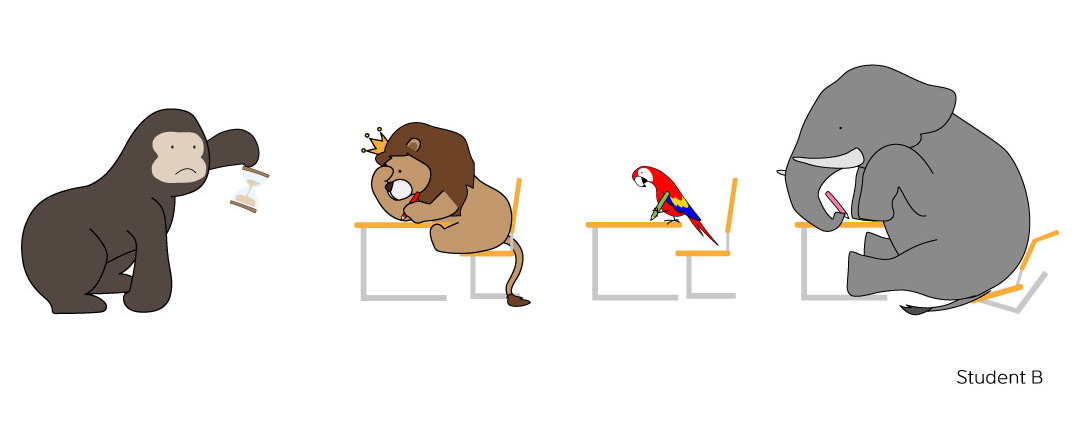 1) 동물세계에 4지선다형의 시험이 처음 치뤄진 것은 젊은 사자가 새로운 왕이 되면서부터였다. 초대 오라클은 세상을 구할 동물 ‘스튜던트 비(Student B)’가 B로 이름이 시작되는 동물이라고 믿었지만, 동물 본부는 그보다는 시험을 통해 그 동물이 누구인지 알아보려 했다.
