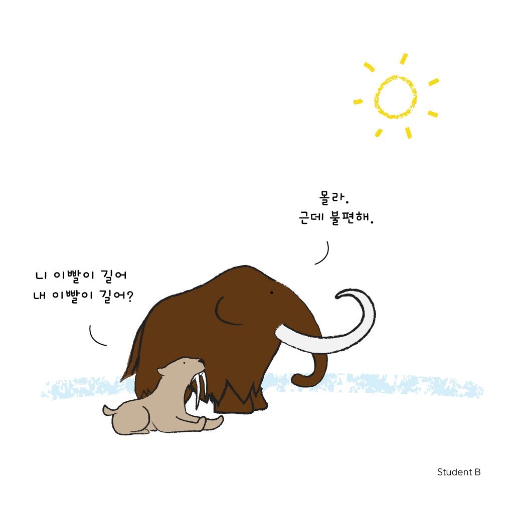 물론 맘모스들이 이 속임수를 끝까지 몰랐던 것은 아니었다. 검치호랑이와의 오랜 전쟁 속에서 모두가 스러져가던 어느 틈새, 한 맘모스가 자신이 어렸을 적부터 키워온 인간에게 다가와 낮은 목소리로 물었다.