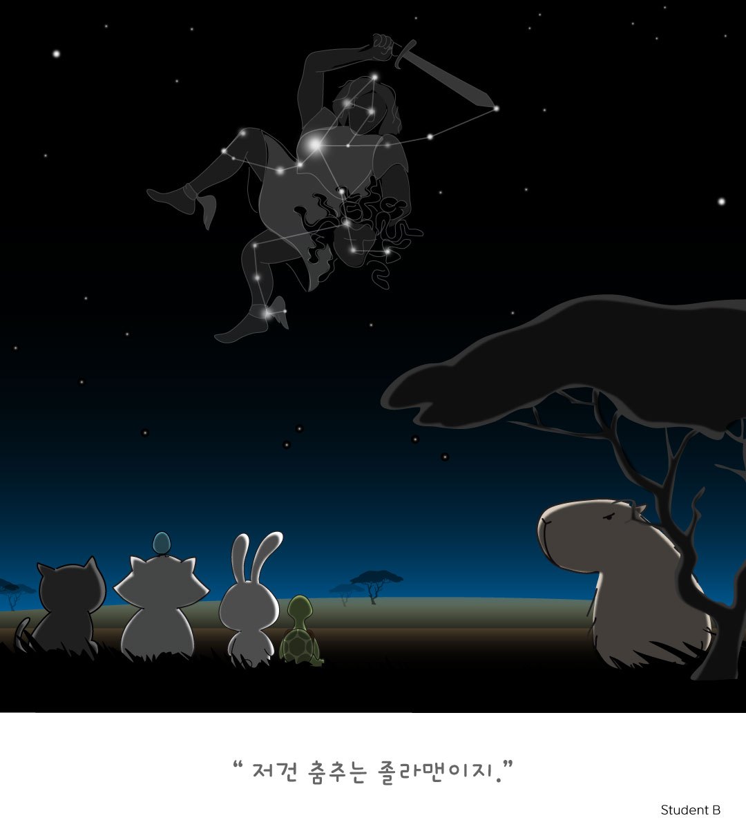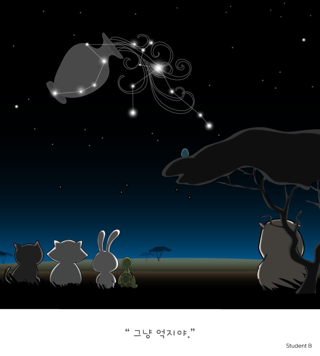 인간들은 동물들보다 많은 것들을 상의없이 미리 정해 놓았다. 그 중에 하나가 별자리이다. 사실 동물들은 우리보다도 훨씬 오래전부터, 무엇인가를 간절히 원할 때 그리고 일이 잘 풀리지 않을 때 밤하늘의 별에게 소원을 빌어왔다. 그들은 인간들이 정해 놓은 별자리들 중 도무지 마음에 들지 않는 별자리들은 자신들이 인정하는 동물들의 모습으로 다시 정해져야 한다고 생각한다.