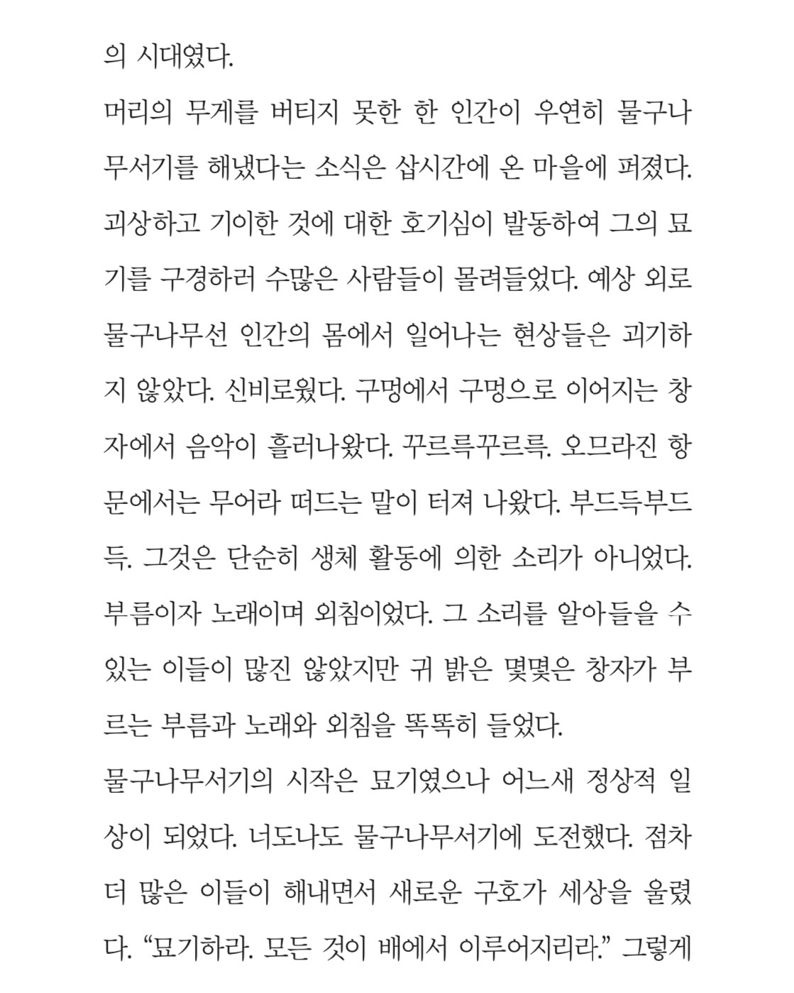<주머니 인간>에 실린 우화 중 ‘묘기하라’는 그 이상한 느낌에서 시작된 이야기다. 세상의 당연한 질서를 이상하게 보는 내가 제일 이상한 것일 테지만, 때때로 나만이 멀쩡하고 이 세계 전체가 이상해 보이곤 한다. 갑자기 어떤 평범한 단어가 의미로부터 해체되어 이상하게 보일 때, 매일 무의식적으로 쓰는 물건이 기능으로부터 해체되어 갑자기 왜 저렇게 생겨먹은 건지 이상하게 보일 때, 어쩌면 이 모든 정상적인 것들이 잘못된 게 아닐까, 의심한다.