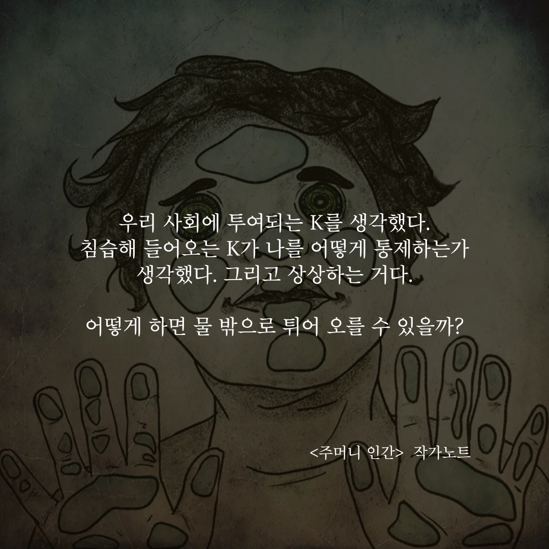 관리 대상으로 지내다 보면 생각하라는 대로 생각하고, 느끼라는 대로 느끼게 됩니다. 사는 게 다 그런 거라는 믿음이 굳어지죠. ‘물속 인간’에는 별종들이 나오는데, 그들은 K에 영향을 받지 않습니다. 별종들은 물밖으로 고개를 내밀어 물밖의 세계를 보고서도 물속으로 돌아와선 아무것도 보지 못한 척합니다. 물밖 세계에 대해 잠긴 인간들에게 아무리 알려봤자, K가 스며든 이들에게 그곳은 닿을 수 없는 세계이기 때문입니다. 별종들은 그저 간간히 물밖으로 나가 허공에 대고 질문을 합니다.
