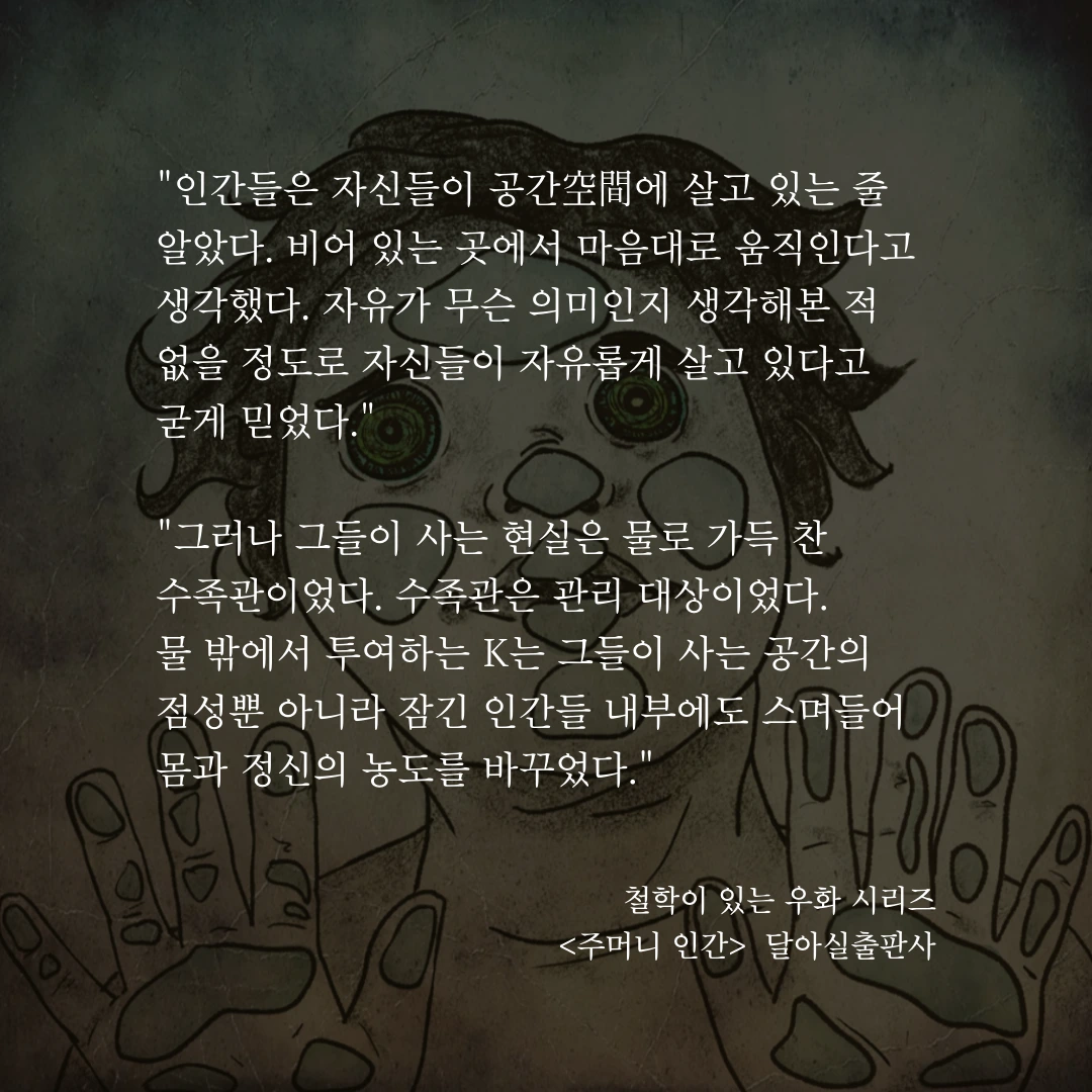 깊고 깊은 물속에 잠긴 인간들이 살았다. 잠긴 인간들은 자신들이 공간空間에 살고 있는 줄 알았다. 비어 있는 곳에서 마음대로 움직인다고 생각했다. 자유가 무슨 의미인지 생각해 본 적 없을 정도로 자신들이 자유롭게 살고 있다고 굳게 믿었다. 그러나 그들이 사는 현실은 물로 가득 찬 수족관이었다. 수족관은 관리 대상이었다. 물 밖에서 투여하는 K는 그들이 사는 공간의 점성뿐 아니라 잠긴 인간들 내부에도 스며들어 몸과 정신의 농도를 바꾸었다. 잠긴 인간들은 신체와 정신이 질겨지는 것을 삶의 이치라 생각했다. 그게 어른이 되는 것이며 철이 드는 것이고 비로소 세월의 흐름을 따르게 되는 것이라고 여겼다. 끈적해지고 질겨지다 마침내 멈추는 것이 그들에겐 당연한 삶의 과정이었다.