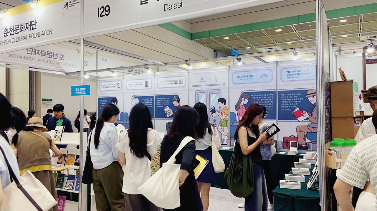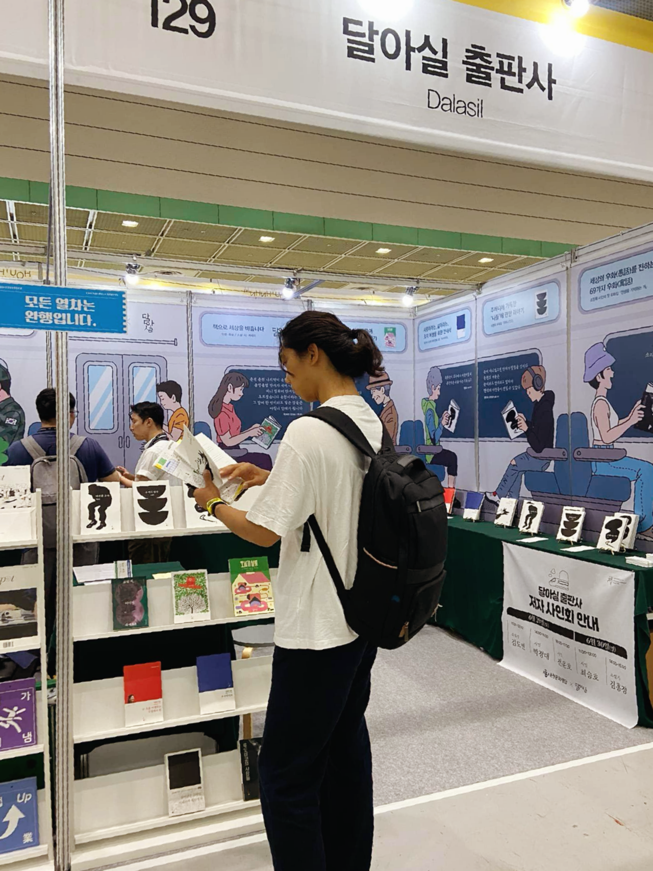 이번에 도서전에 방문하게 된 건, 지난 5월 출간된 저의 책 <주머니 인간>이 전시된다고 해서였습니다. 달아실출판사가 춘천문화재단과 함께 도서전에 참가했거든요. 지금까지 달아실에서 나온 소설과 시집들이 전시되었는데, '철학이 있는 우화' 시리즈가 중점적으로 소개됐습니다. 시리즈는 현재까지 총 4권이 나왔는데요. 어른들이 읽는 동화라기엔 좀 더 그로테스크한 느낌이 있는 우화들을 묶은 소설집입니다.