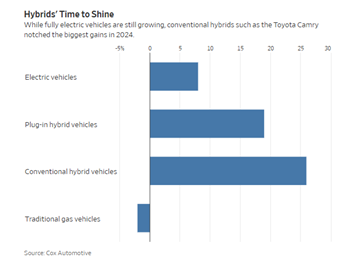 월스트리트 저널은 2024년에는 전통적인 하이브리드 차량이 가장 큰 성장세를 보였다고 분석했습니다.