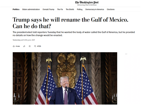 도널드 트럼프 대통령 당선인은 7일 플로리다 팜비치에 있는 마라라고 클럽에서 열린 기자회견에서 “우리는 멕시코만의 이름을 아메리카만(Gulf of America)으로 바꿀 것입니다. 얼마나 아름다운 이름입니까. 아주 적합한 이름입니다”라고 말했씁니다.