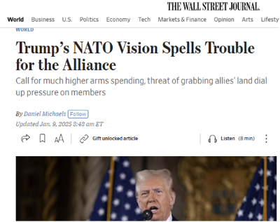 월스트리트 저널에 따르면 지난해 트럼프는 선거 운동 중에 “(러시아가 비용을 많이 쓰지 않는 나토 동맹국을 공격할 경우) 나는 그 나라들을 보호하지 않을 것이다. 그 나라들은 비용을 지불해야 한다”라고 말했습니다.