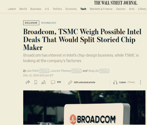 월스트리트 저널은 "브로드컴이 인텔의 칩 설계 및 마케팅 사업 인수를 검토하고 있다"라 "TSMC 역시 투자자 컨소시엄을 통해서 인텔의 일부 또는 전체 반도체 제조 공장을 인수하는 방안을 검토하고 있다"라고 보도했습니다.