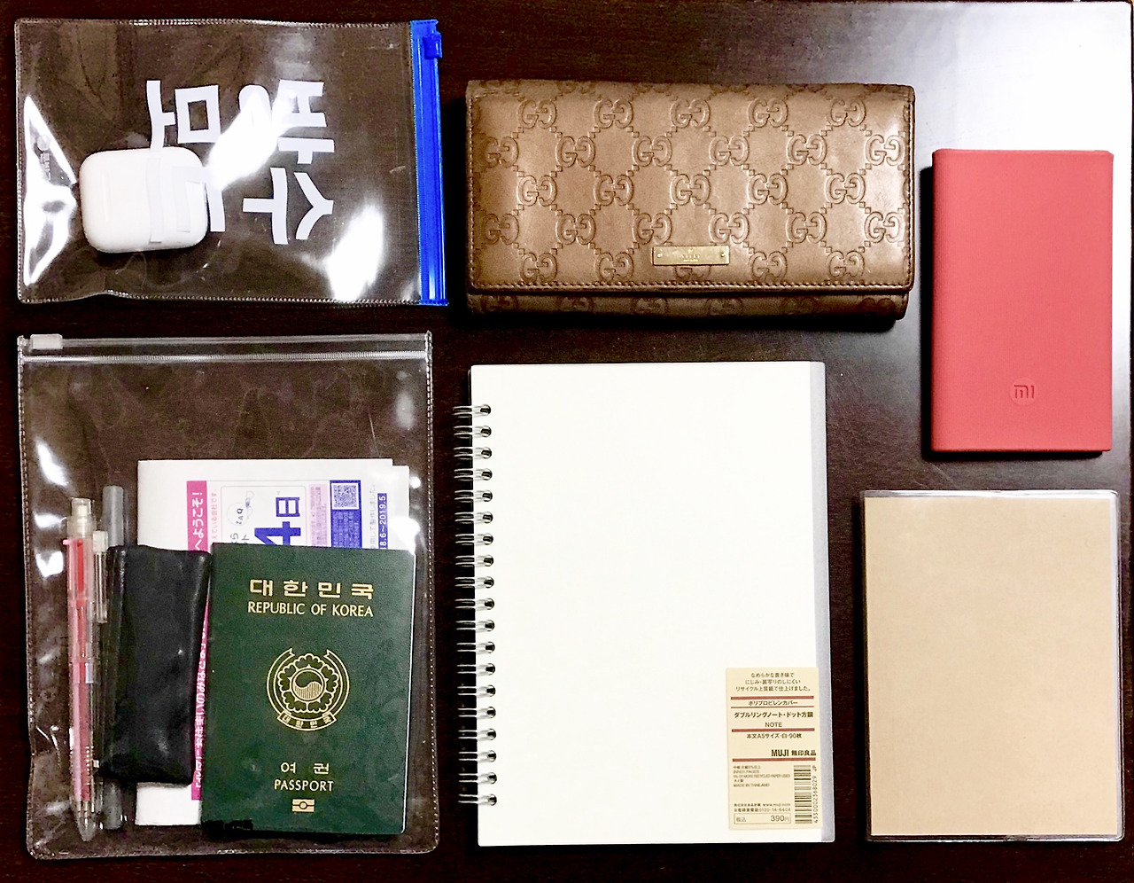 새로 산 에어팟, 지갑, 보조배터리, 필기도구, 각종 증명서, 여권, 노트, 스케쥴러가 가방에 들어있습니다. 해외에서 살면 여권은 거의 필수품이네요.