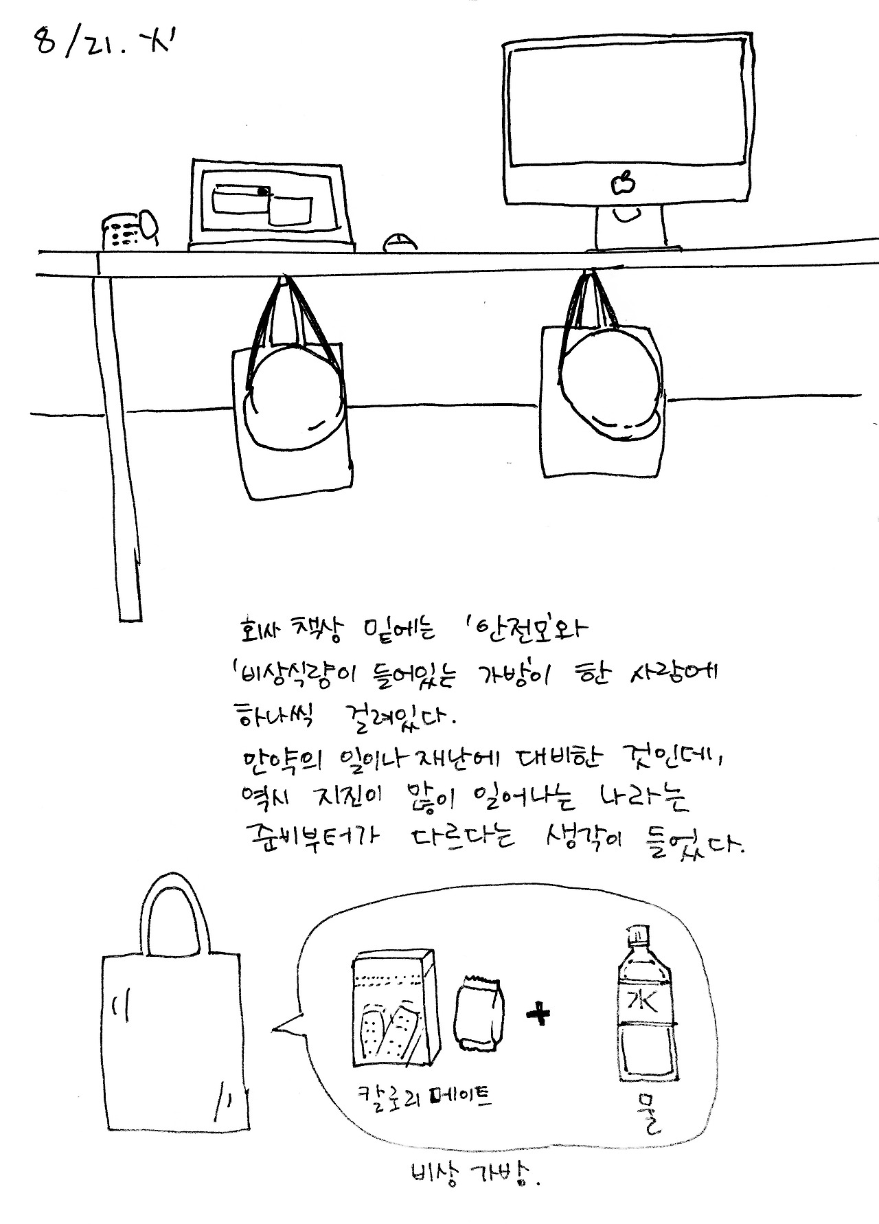 흰 가방 안에 뭐가 있는지 감이 잘 잡히지 않아 내용물을 학인해봤다. 비상 식량인 칼로리메이트(한국은 칼로리발란스라는 카피제품이 있다)와 물이 들어있었다.