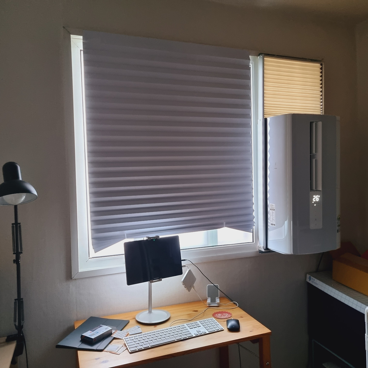 원래는 복도에 사람이 지나다니면 신경이 쓰여서 잘 사용하지 않던 방이었는데, 에어컨 설치 후 낮에는 노트북과 함께 그 방에서 나오지 않았다. 방에서 지내는 시간이 많아지면서 5천 원짜리 종이 블라인드로 창문을 막고 작은 책상을 펴 두었다. 덕분에 거실에 있는 32인치 모니터와 데스크톱은 여름 내 전원조차 켜지 못했다. 체력이 안되어 모니터를 옮기는 것도 무리여서 조그마한 태블릿 화면으로 버텼다. 덥지만 큰 화면과 편한 책상과 의자 vs 시원하지만 좁고 불편한 환경 중에 선택해야 했다.