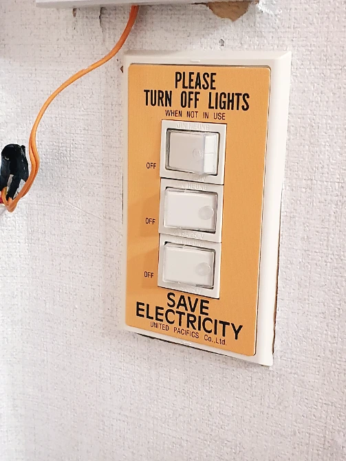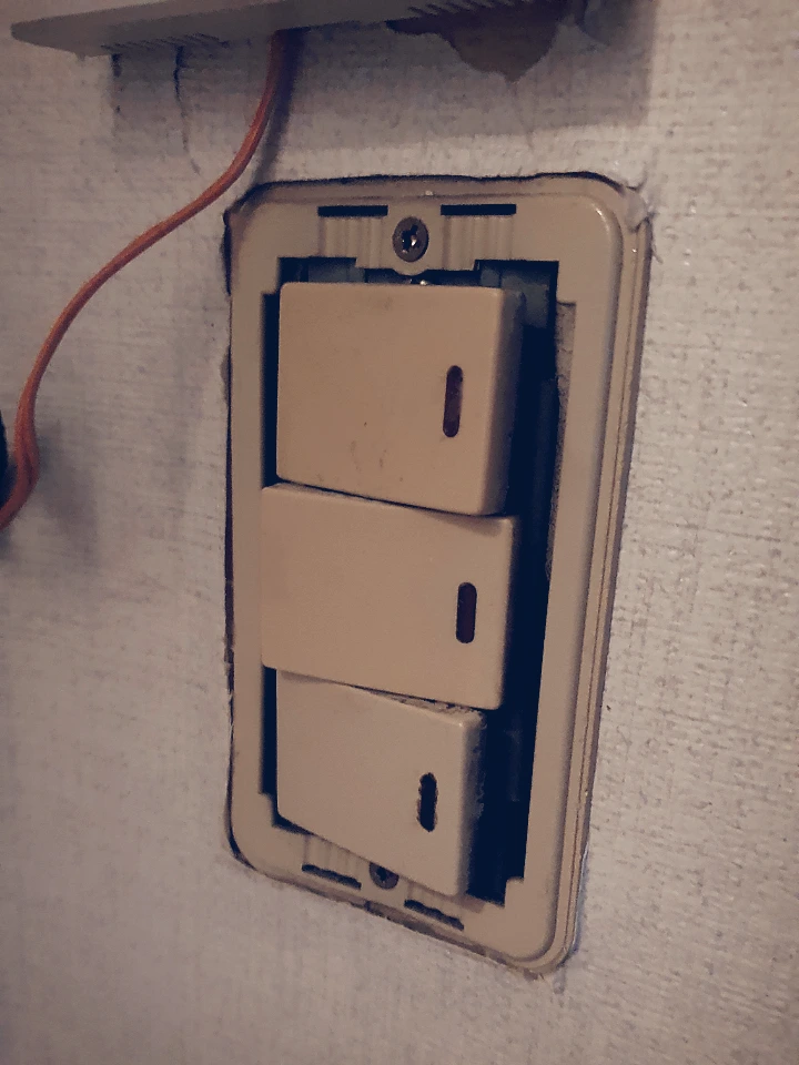 잔광을 유발하던 램프 스위치. 교체하면서 집안의 다른 스위치와 최대한 비슷한 디자인으로 맞춰주었다. 새로 교체한 조명에서도 잔광이 발생했다. 이 경우는 스위치 때문이었는데, 스위치 자체에 불이 들어오는 램프가 내장된 제품이었다. 이 스위치를 램프가 없는 것으로 교체하니 해결되었다.
