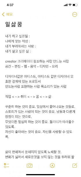 '일, 삶, 꿈’이라는 제목의 메모장에는 여러 가지 질문과 그에 대한 나의 대답들이 적혀있다. 질문 중에는 하고 싶은 일, 나에게 맞는 적성 등이 있는데 이런 질문에 대답하기 전에 나는 정의한 문장이 눈에 띈다. ‘creator 크리에이터, 창조하는 사람, 만드는 사람’. 사실 회사에 다니면서 잊고 살았는데 바로 내 정체는 이거였다. 뭔가를 만들고 창조하고 표현하는 사람. 그런 사람이 내가 되고 싶었다. 디자이너 같은 아티스트. 아티스트 같은 디자이너. 모호한 경계에 있는 프로듀서. 만드는 사람, 표현하는 사람, 목소리가 있는 사람.