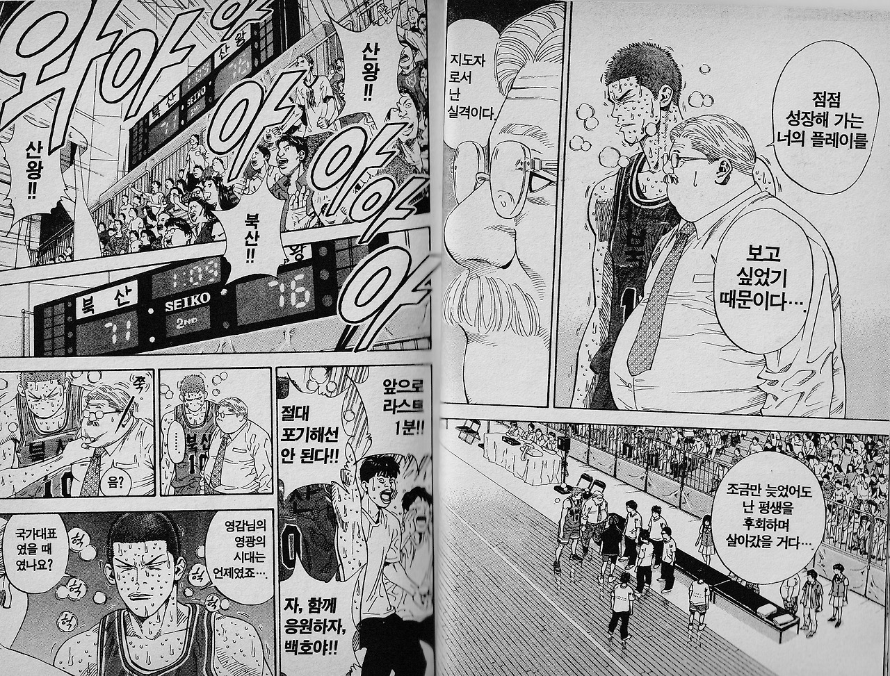 점점 경기가 어려워지는 상황 강백호는 선수 교체를 요청한다. 하지만 안 감독은 "난 지도자로서 실격이다. 점점 성장해 가는 너의 플레이를 보고 싶었기 때문이다. 조금만 늦었어도 난 평생을 후회하며 살아갔을 거다..."란 말을 하며 선수 교체를 취소한다. 강백호의 선수생명을 걱정하며...