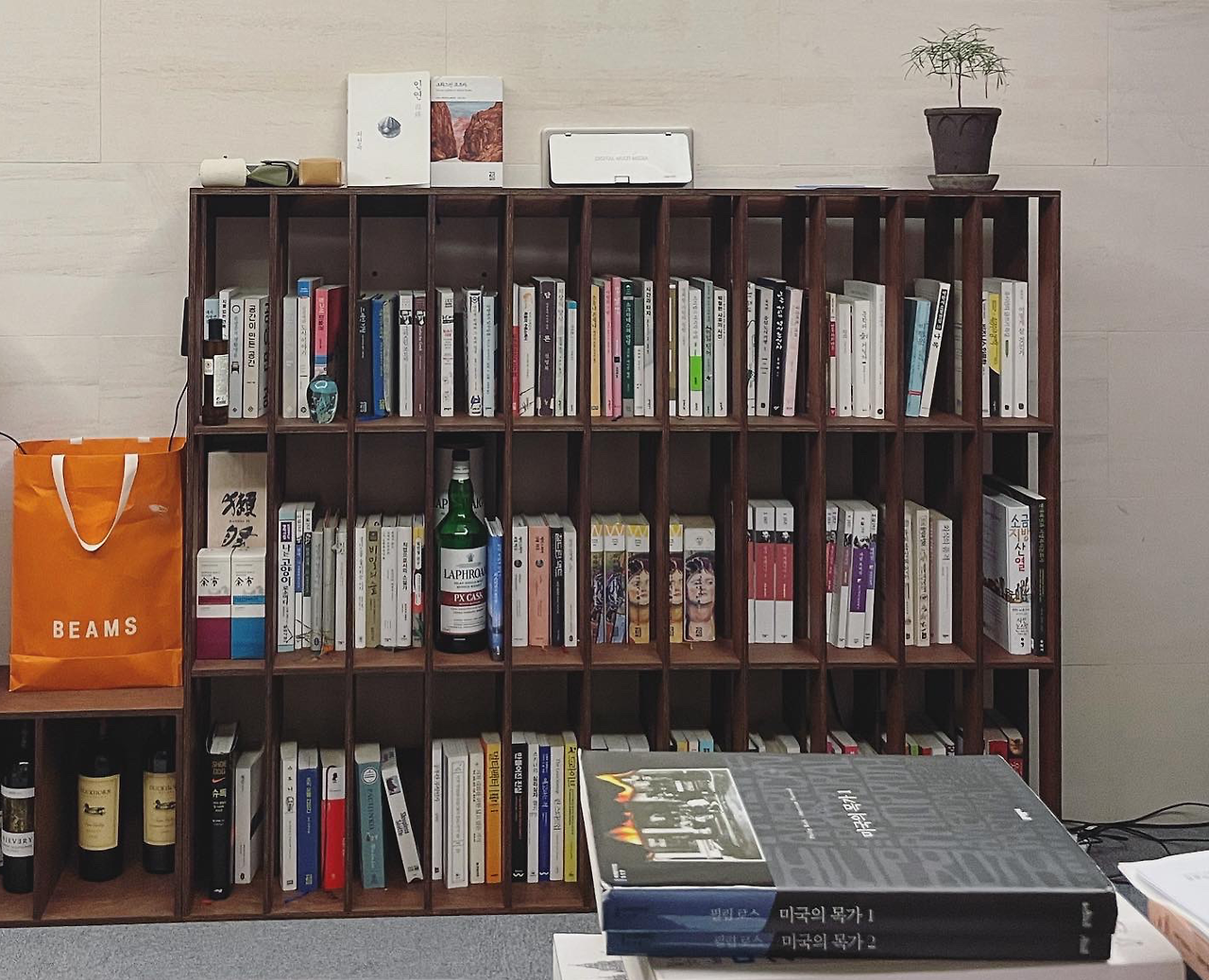 이곳에 유달리 많은 건 책과 술이다. 도합 수백 개의 책과 술이 전반적인 공간의 성격을 만들었다. 거기에 그간 미술관을 다니며 영감이 돼준 전시의 공기와 알고리즘이 설계한 광고 폭격에 당해버린 반자의적 소비의 물질이 나머지를 채우고 있다. 간간히 ‘이게 여기 왜 있지’ 싶은 소품도 세계 문학 진열장에 튀어나온 과학 도서처럼 어색하게 끼어있는데, 보통은 여행 중에 어쩌다 훅 꽂혀서 앞뒤 없이 들여온 귀여운 녀석들이다.