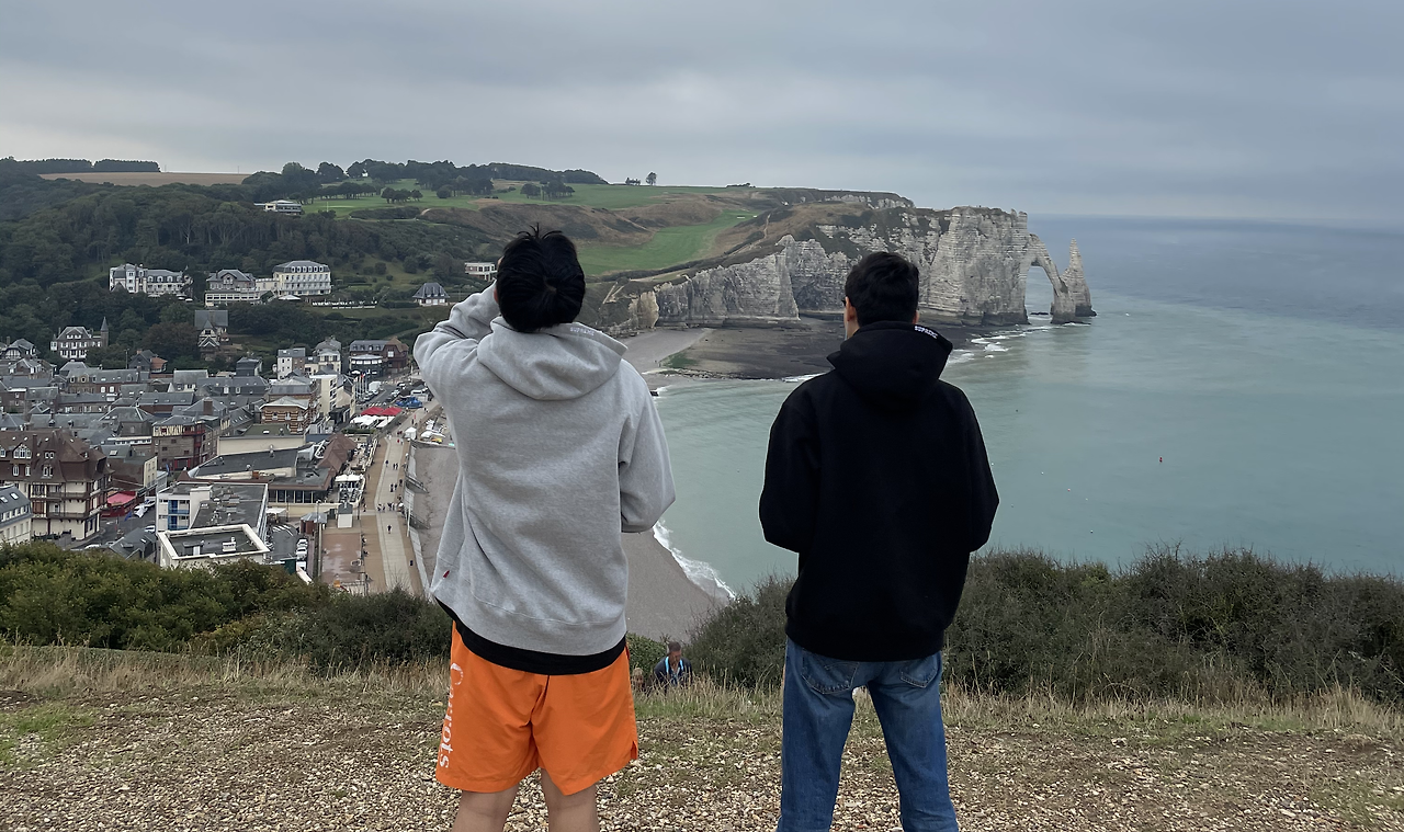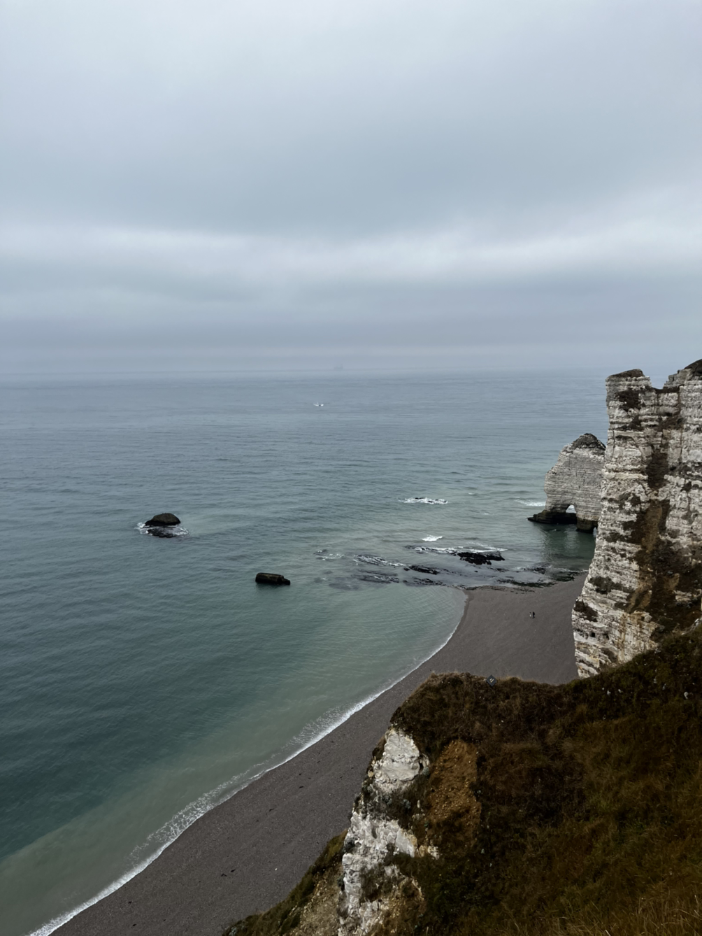 프랑스를 두 번 와봤긴 하지만 전부 파리에서만 시간을 보냈기 때문에 한적한 시골 마을의 정취가 프랑스라는 느낌이 안 들 정도로 낯설고도 편안했다. 길을 주욱 걸어 내려가며 가이드 님의 설명을 듣고 주변 주택들을 구경했다. 십오 분쯤 걸었을까, 코끼리 모양 절벽이 보이는 자갈 해안에 도착했다. 날씨가 흐린 탓에 생각만큼 아름답게 보이진 않았다. 가이드 님은 원래 노르망디 지역이 워낙 비바람이 많고 날씨가 안 좋은 지역이라 이 정도면 괜찮은 편이라고는 하긴 했다. 다만 나는 처음 바다를 보는 사람이 있다면 그냥 제주도를 데려갈 것 같다.