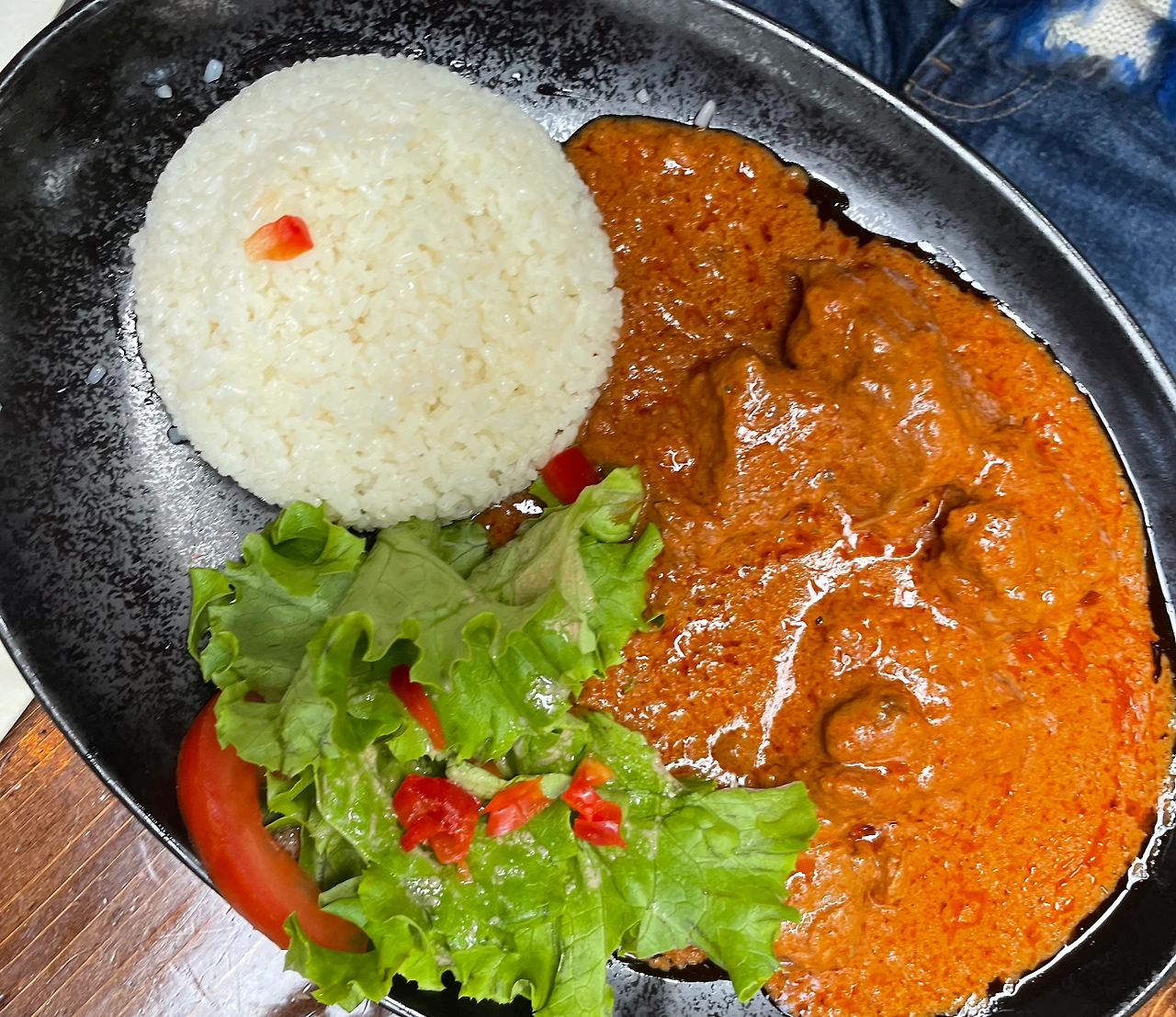 첫 번째 메인 요리로는 붉은 돼지갈비찜 느낌의 굴라쉬(Gulyás, 헝가리의 진한 토마토소고기스튜) 비슷한 요리가 포슬포슬한 밥과 함께 나왔다. 고기가 조금 퍽퍽한 느낌이 있었지만 간도 괜찮고 소스의 맛도 좋았다. 질감이 좀 다르긴 했지만 한국 카레라이스 느낌으로 밥에 소스를 슥슥 비벼먹는 감성이 맘에 들었다. 친구는 곧 한국으로 가지만 나는 한국 밥이 5일이나 남았으니 비슷한 게 보이면 먹어둬야 한다.