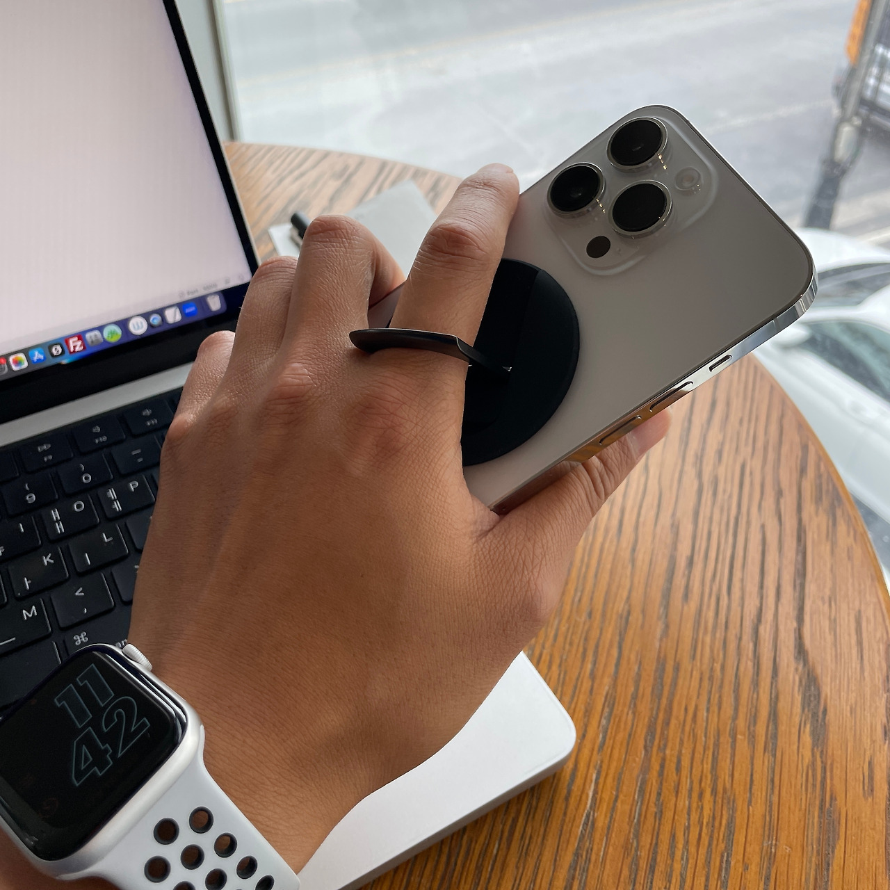 저는 폰 케이스를 잘 안 쓰고 생폰으로 자주 쓰는 편인데, 얼마 전에 엄청 크고 무거운 아이폰 14 프로 맥스로 바꿨더니 그냥 들고 있기가 좀 불안해서 링 그립을 사용하면 좋겠다는 생각도 있었고요. 이래저래 저한테는 딱인 제품입니다. 이번 아이폰의 엄청난 카툭튀도 신경 쓰지 않고 테이블에 내려놓을 수 있게 되었습니다.