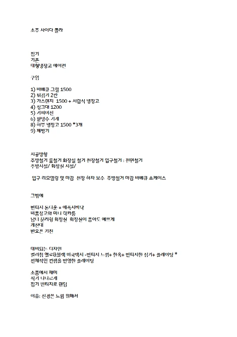 그러나 총 18평의 공간에서 주방을 7평을 잡았는데 요리 시 필요한 주방집기들이 공간에 비하여 꽤 많은 편이었습니다. (아래 동선 표 참조) 당연히 좁은 공간에서 주방집기의 물리적 사이즈 때문에 남녀 분리형 화장실이 확보될 수 있는 공간이 나오질 않았습니다. 심지어 기존 세팅하려는 주방기기들의 자리도 부족하였죠.