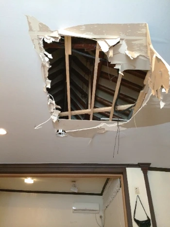 외부 측면을 보았을 때는 한옥이 맞는데 내부 구조를 분석했을 땐 뭔가 엇갈리기 시작했습니다. 내부에 기둥이 전혀 보이지 않아서였는데요. 천정을 철거하면서 하중을 받치기 위한 철근 골조가 드러났습니다. 그런데 상부의 하중을 받는 H빔이 없는 임시방편의 철근 골조였습니다. 지붕의 무게를 감당하기 어려운 구조이죠. 언제 무너져내려도 이상할 게 없는 마구잡이식 개조였습니다.