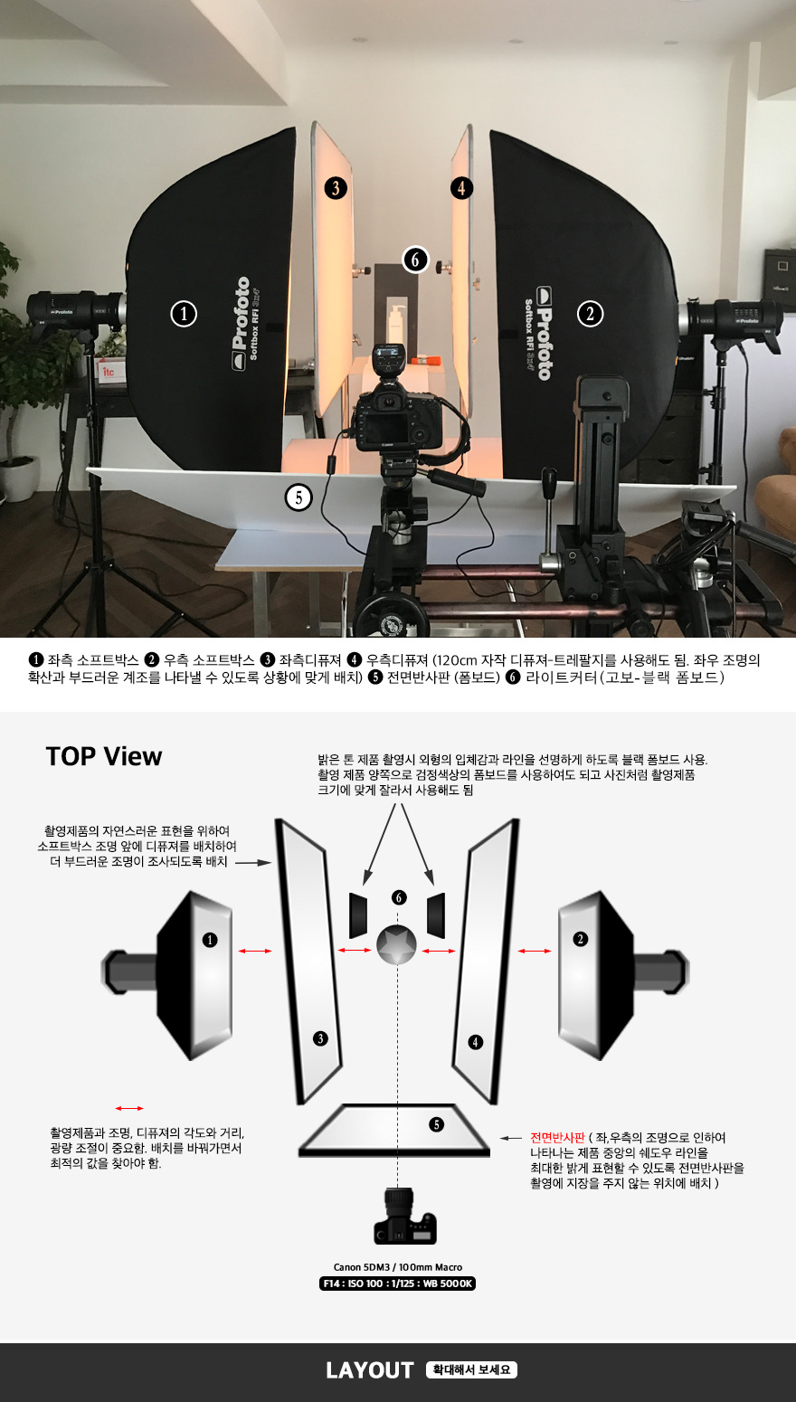 5. 전면반사판 (화이트 폼보드) - 좌, 우측 조명 사용 시 제품 중앙에 나타나는 쉐도우 라인을 최대한 밝게 표현 ( 촬영에 지장을 주지 않는 위치에 배치 )