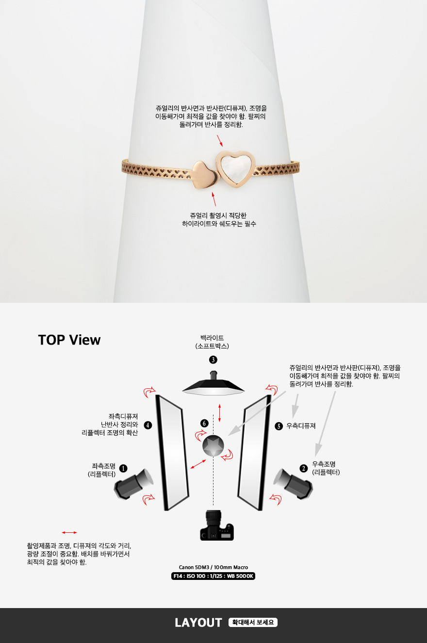 쥬얼리 촬영시 조명의 모델링을 이용하여 빛이 들어가는 부분과 반사면을 확인해가며 촬영하여야 합니다.