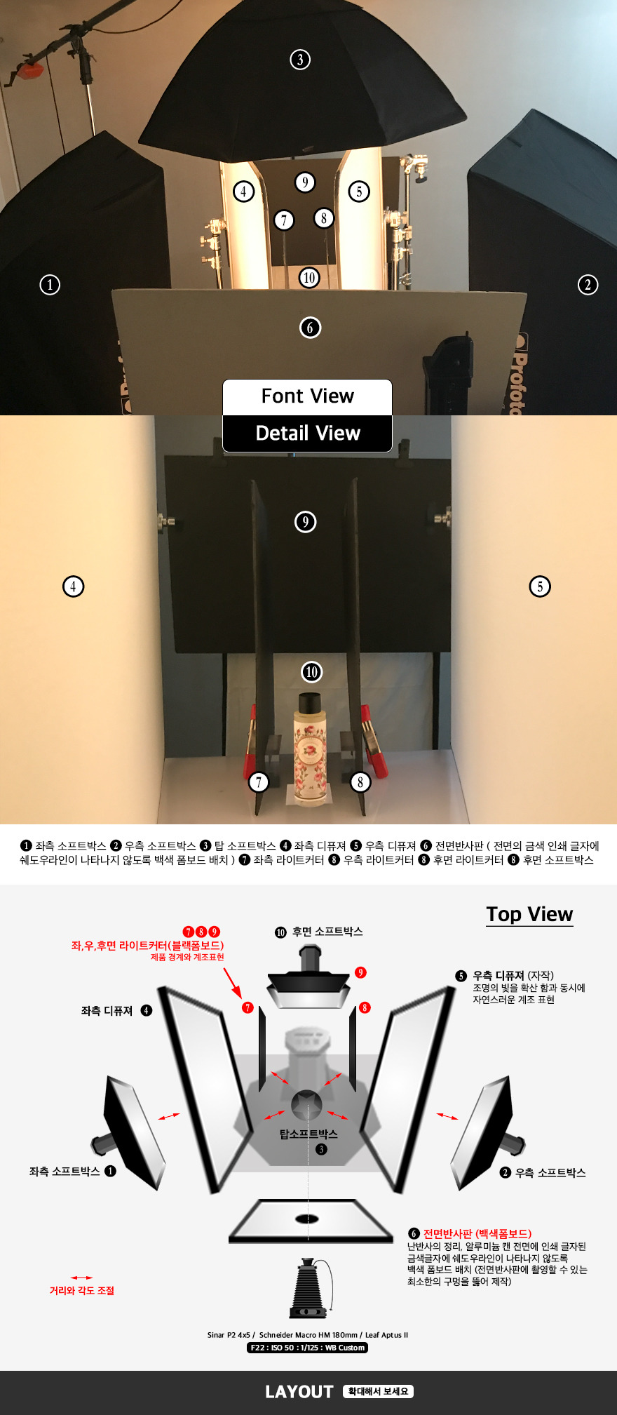 10. 후면 소프트박스 - 촬영제품의 내용물의 투명도 표현 ( 바디 오일의 내용물을 확인할 수 있도록 백 라이트 배치 )