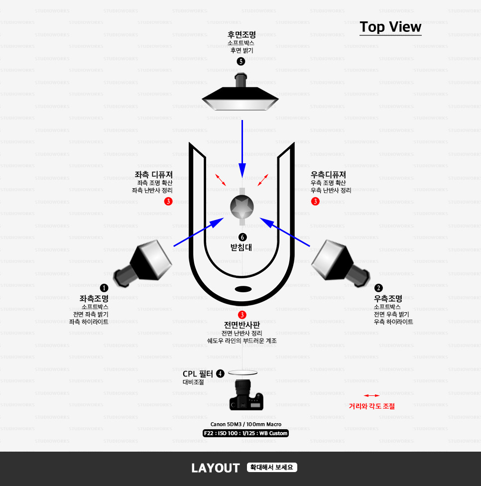 - 일반적으로 원형 제품 촬영 시 좌우의 평면 디퓨져 또는 반사반과 전면의 평면 반사판 배치하여 촬영합니다. 그러나 디퓨져와 반사판이 교차되는 부분의 경계가 원형 전면에 나타날 수 있으므로 한장의 트레팔지 또는 아크릴 사용하여 경계 교차점이 없도록 부드럽게 표현합니다.