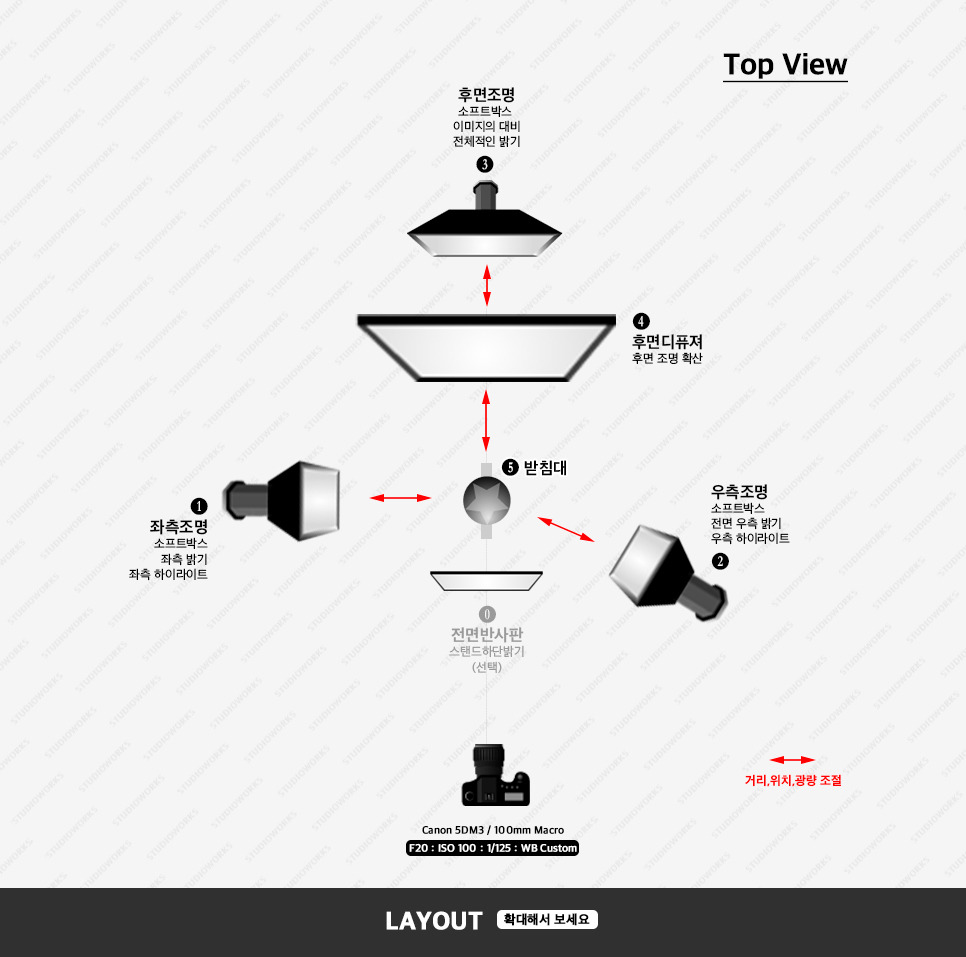 3. 후면 조명 - 소프트박스 사용, 전체적인 대비와 밝기를 표현.