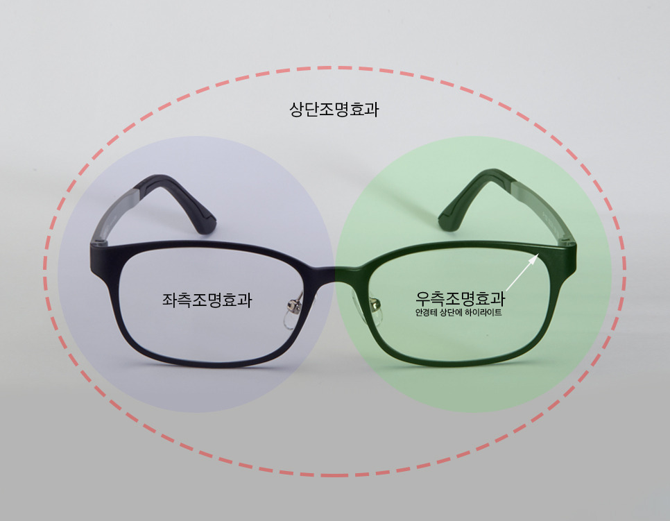 - 좌측 소프트박스 조명에 비해 강도가 높은 리플렉터를 사용하여 안경테 우측 상단에 하이라이트를 표현하여 입체감을 확보함.