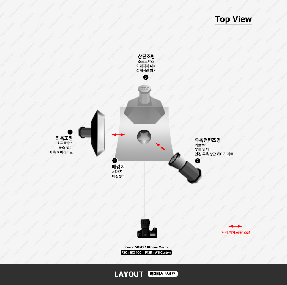 3. 상단조명 - 소프트박스 사용, 전체적인 밝기와 대비의 조절. 상단(탑)조명이 없다면 좌,우측의 조명에 의한 밝기는 확보가 되나 대비가 다소 떨어질 수 있음. 다소 계륵같은 존재처럼 느껴질 수 있으나 필수적으로 사용하기를 권장.