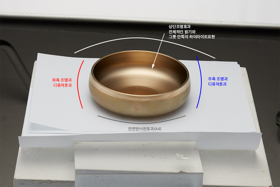 - 방짜유기 그릇의 전면 노출을 반사판을 이용하여 확보. 촬영에 지장이 없는 범위 내에 앞에서 동그랗게 말아서 배치.