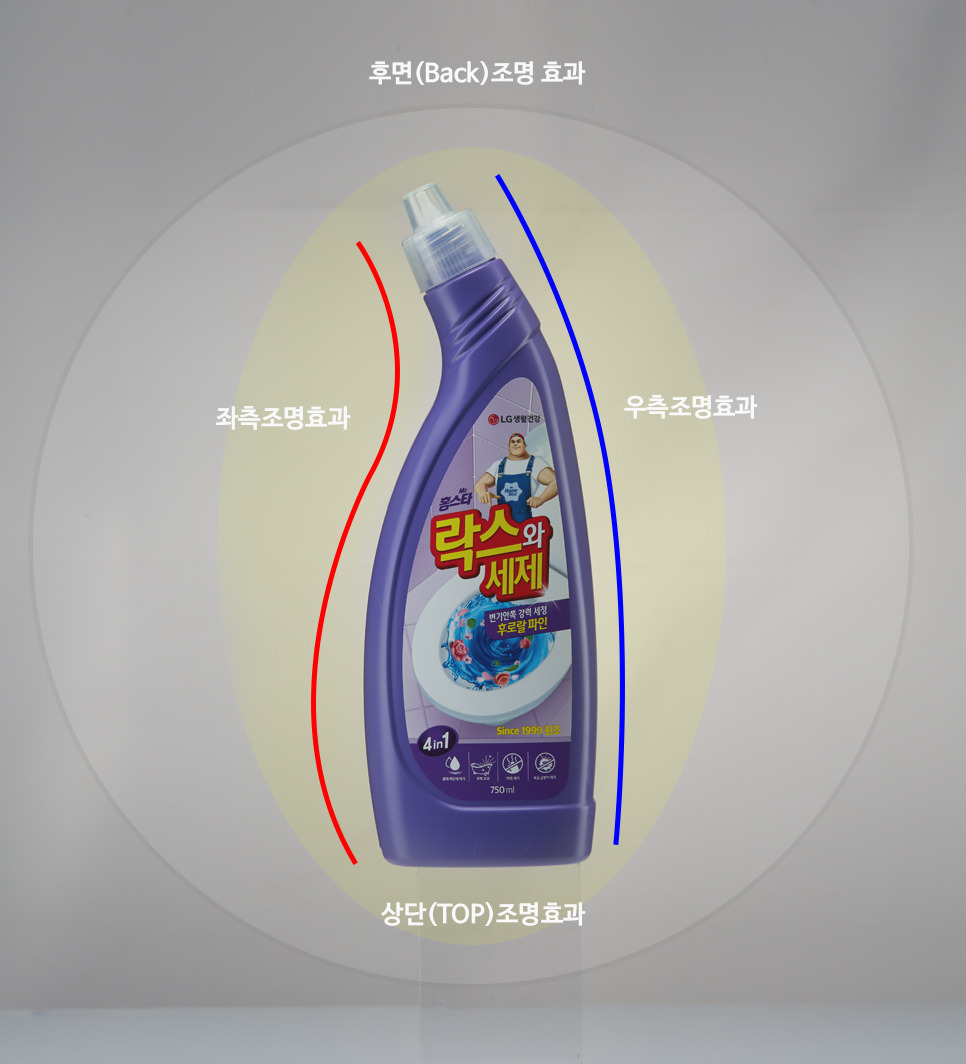 이번 촬영제품의 경우 외형은 랜덤한 곡선 형태이며 재질은 플라스틱 PET 무광으로 제작된 주방세제 종류입니다. 유광 제품이나 반사가 심한 제품이 아니기 때문에 촬영의 난이도는 높지 않습니다.