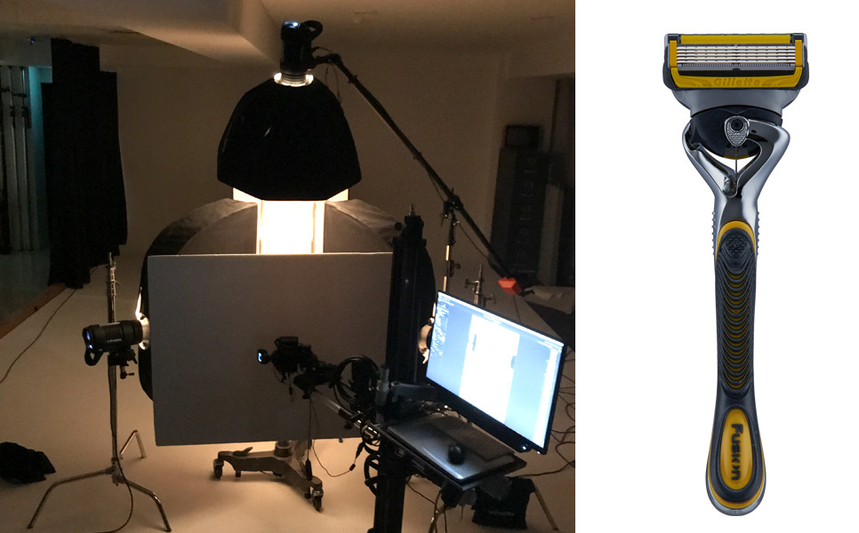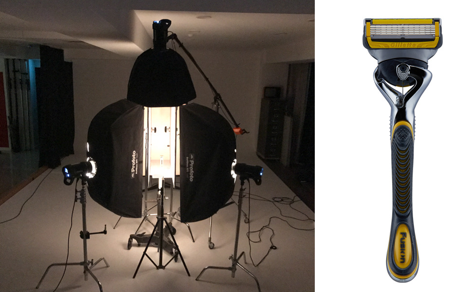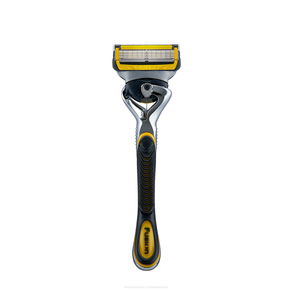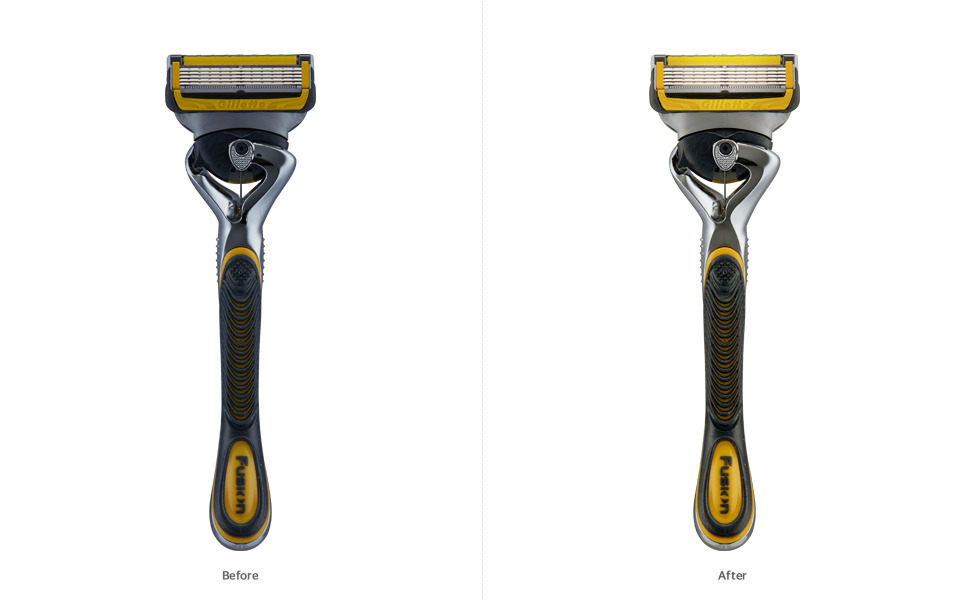 이번 촬영 제품인 면도기의 경우 손잡이는 원형, 면도날 부분은 직선의 면 형태인 반사가 심한 제품으로 촬영의 난이도가 높은 편입니다. 특히 면도기의 경우 손잡이 원형 부분이 랜덤한 형태로 제작되었기 때문에 정리할 수 없는 반사들이 존재하므로 후보정을 통하여 정리하여야 합니다.