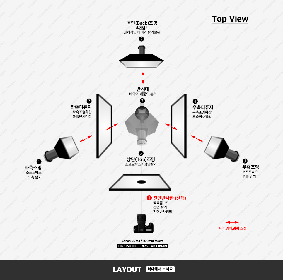 6. 후면(Back) 조명 - 소프트박스 사용, 후면 밝기, 제품의 경계, 전체적인 밝기와 대비의 보완
