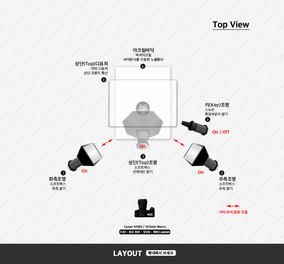 - 좌,우, 상단의 조명 사용시 깨끗한 이미지를 얻을 수 있으나 다소 밋밋한 느낌이 들 수 있으므로 스누트나 리리플렉터를 사용하여 하이라이트를 강조함. 꼭 사용할 필요는 없으나 촬영자의 선택에 의해 사용하면 됨.