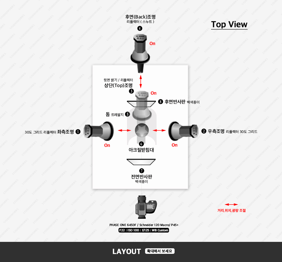 4. 후면(Back) 조명 - 리플렉터(스누트, 그리드 30도), 반지 링 안쪽과 전체적인 밝기, 대비의 보완.