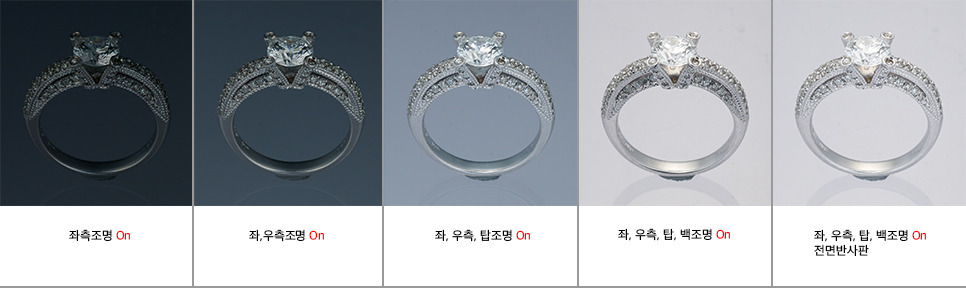 보석 반지를 촬영 시 반지의 링도 중요하지만 다이아의 컷팅 면의 디테일을 제대로 표현하여야 합니다. 또한 쥬얼리와 같은 작은 제품 촬영 시 모든 반사를 정리할 수도 없거니와 그럴필요도 없습니다. 적당한 쉐도우와 하이라이트가 있어야만 쥬얼리 특유의 느낌이 나타나기 때문입니다.