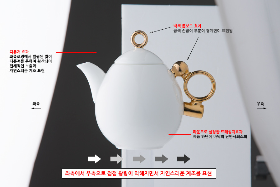 타원형으로 제작된 도자기 티포트는 주변 환경(물체)을 비롯한 조명, 반사판 마져도 비쳐지기 때문에 난반사를